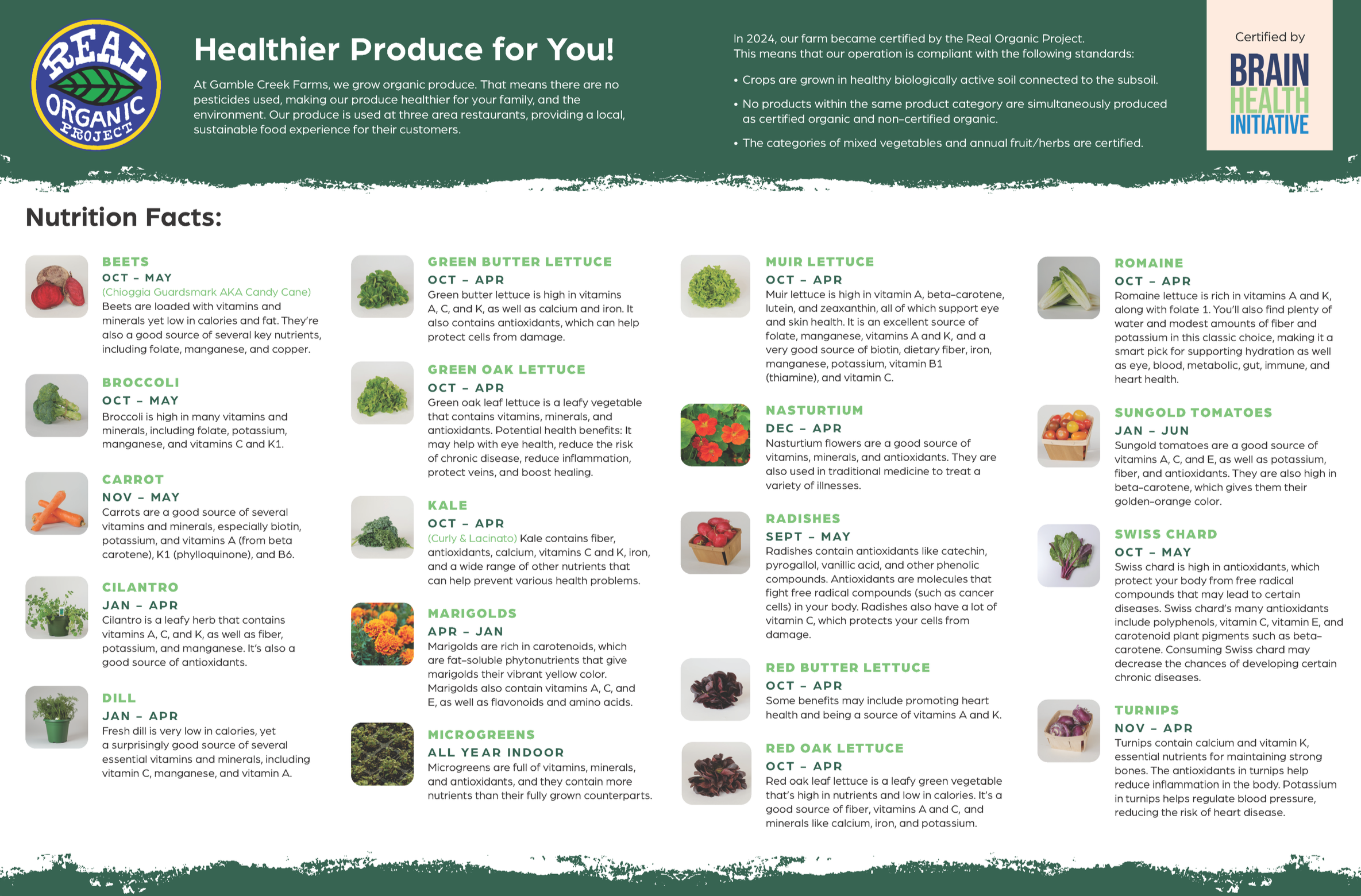 Wholesome nutrients come from the produce at Gamble Creek Farms – and they support overall well-being and longevity. Our partnership with the Brain Health Initiative has educated us on the important link between what we eat and our brain health.